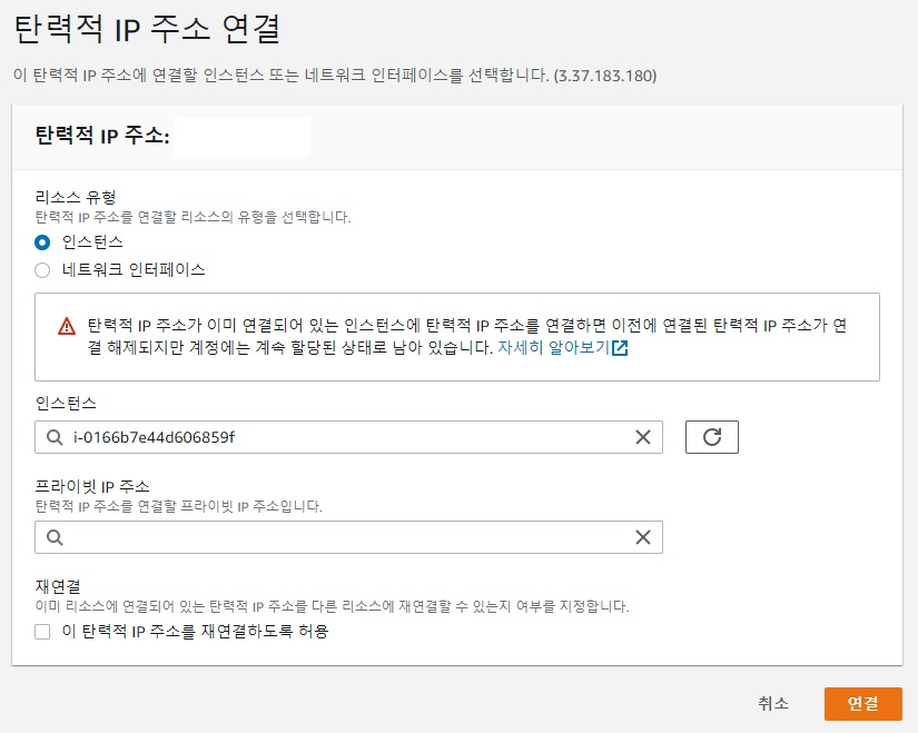 연결한 인스턴스와 프라이빗 주소를 선택해주시고 연결을 눌러줍시다.