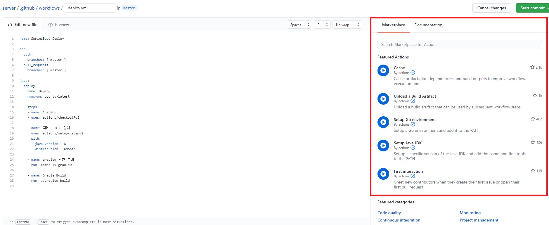github action 으로 이동하여 워크 플로우를 작성해 줍시다.