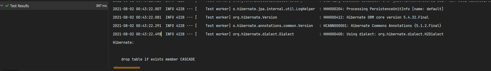 2021-08-02 00:43:22.498 INFO 4228 --- [ Test worker] org.hibernate.dialect.Dialect : HHH000400: Using dialect: org.hibernate.dialect.H2Dialect